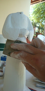 1) Se comienza tallando una estructura (que hará de cuerpo) con yeso betalfa luego se sigue con la cabeza y las manos.